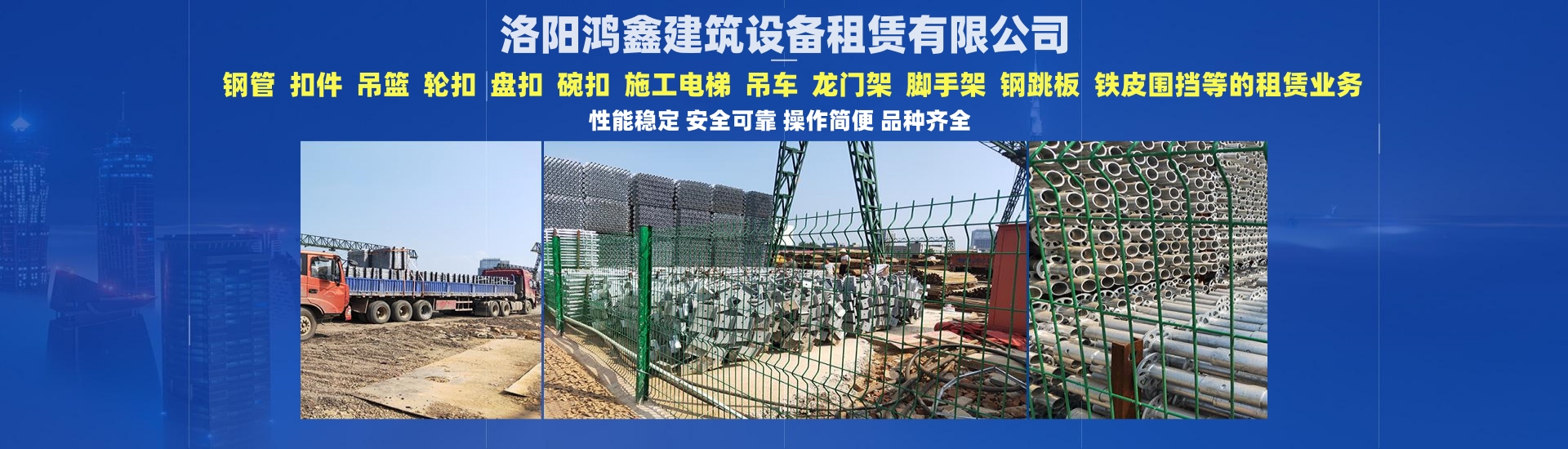 洛陽(yáng)鴻鑫建筑設(shè)備租賃有限公司專(zhuān)業(yè)從事:鋼管.扣件. 吊籃.輪扣.盤(pán)扣.碗扣.施工電梯.吊車(chē).龍門(mén)架.腳手架,鋼跳板、鐵皮...